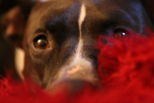 Georgie is a pit mix (mixed with what I don't know), and was also a rescue; I got her from a family who had found her as a badly beat up stray and was fostering her. She's the best little companion you can imagine, and Mark and I absolutely adore her. When I first got her she definitely had a lot of fear issues from whatever she endured before she was rescued, but she's a very confident and happy dog now; in fact she probably gets sick of all the affection we heap on her every day. I never get tired of hearing her grunt with satisfaction when she snuggles up with us on the couch, seeing her roll over on her back when she wants her belly rubbed, or feeling her velvety soft face next to mine. I feel truly blessed to have Georgie in my life, and I cherish every single minute I get to spend with her. I can't imagine what sort of a person could be cruel to these sweet, loving dogs.